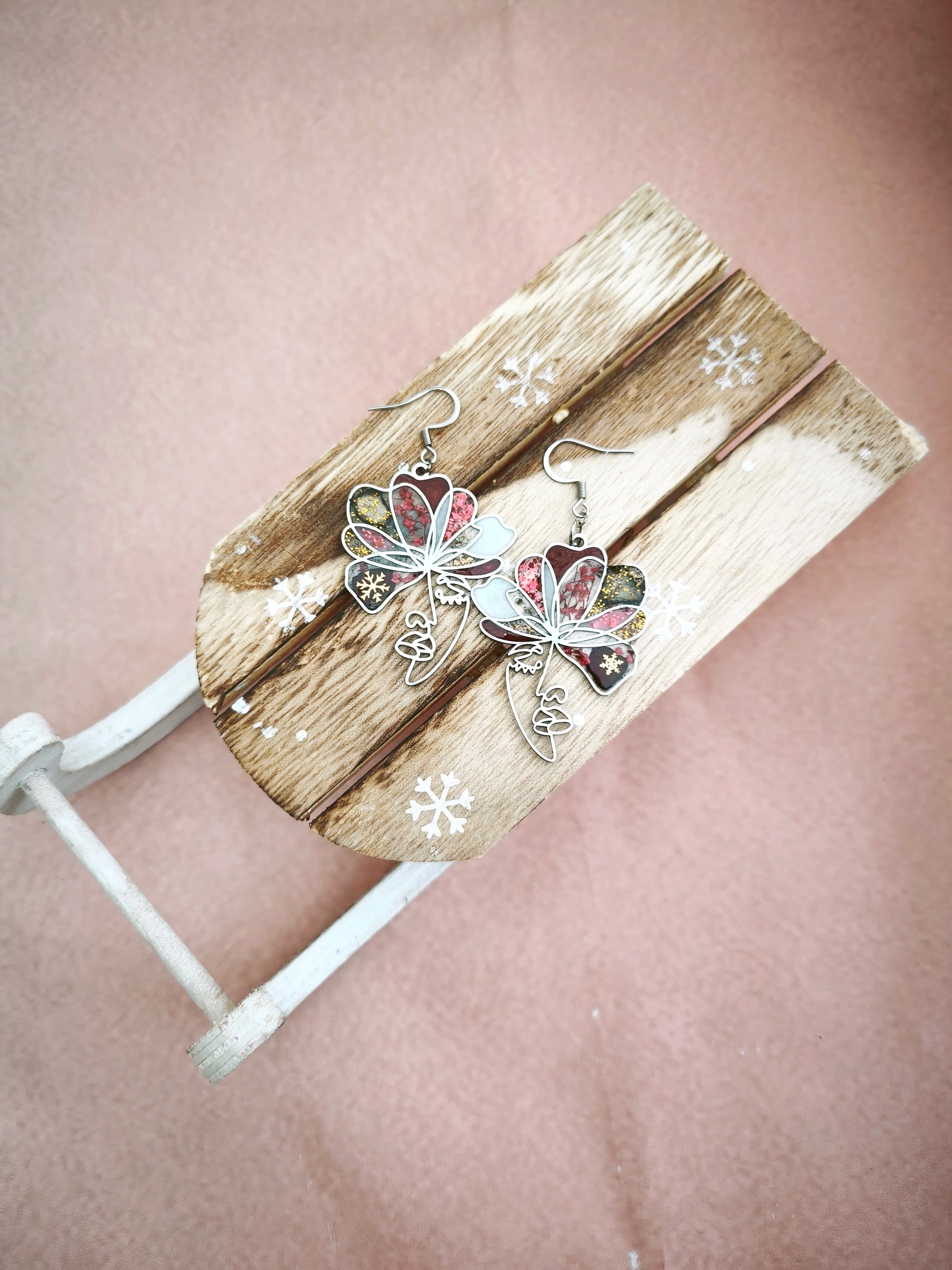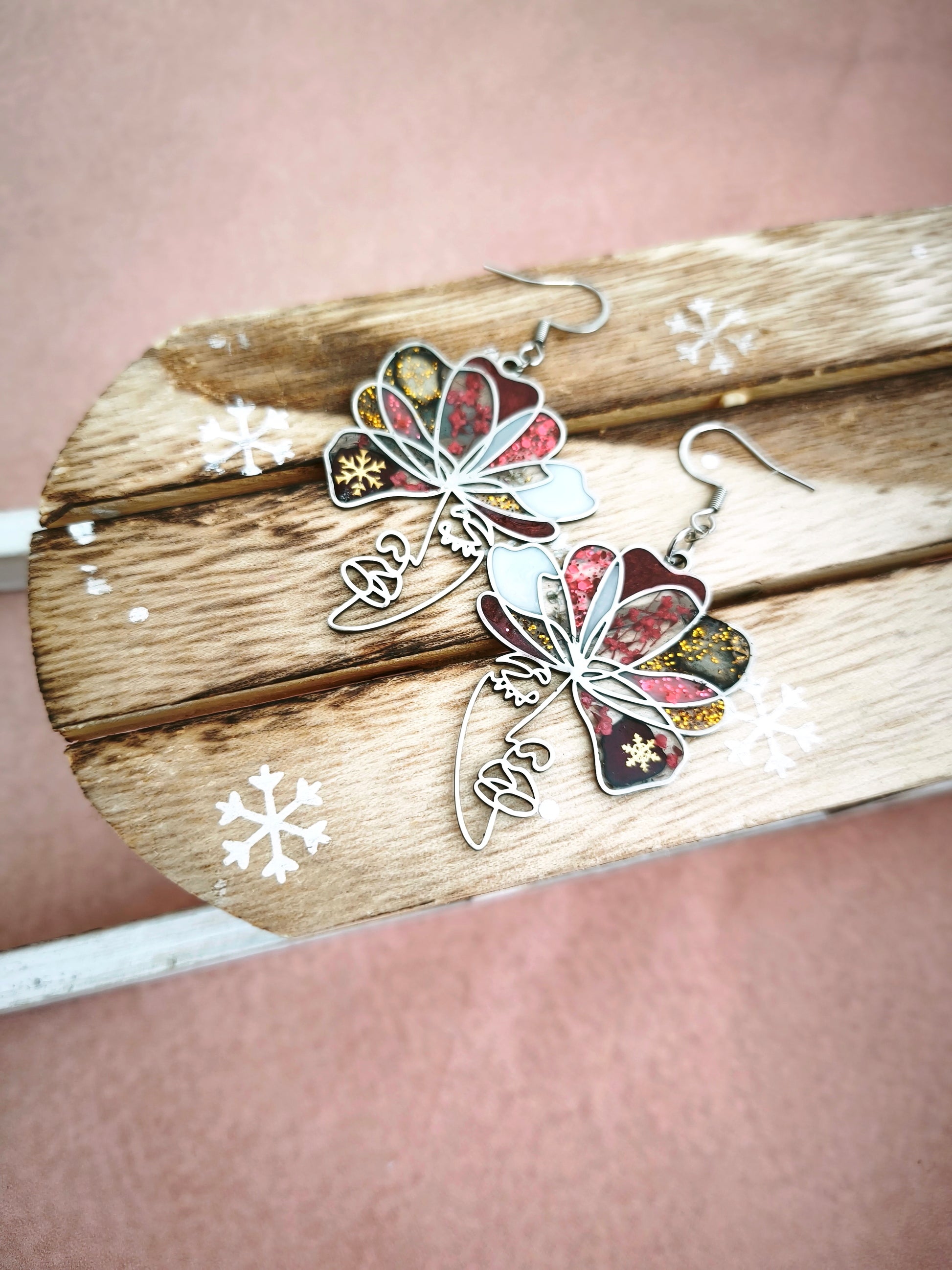 Leur design poétique – un visage stylisé qui s’ouvre en pétales mélangeant rouges et blancs scintillants de résine – en fait une pièce artistique et aérienne, parfaite pour illuminer ton look sans alourdir ton style.