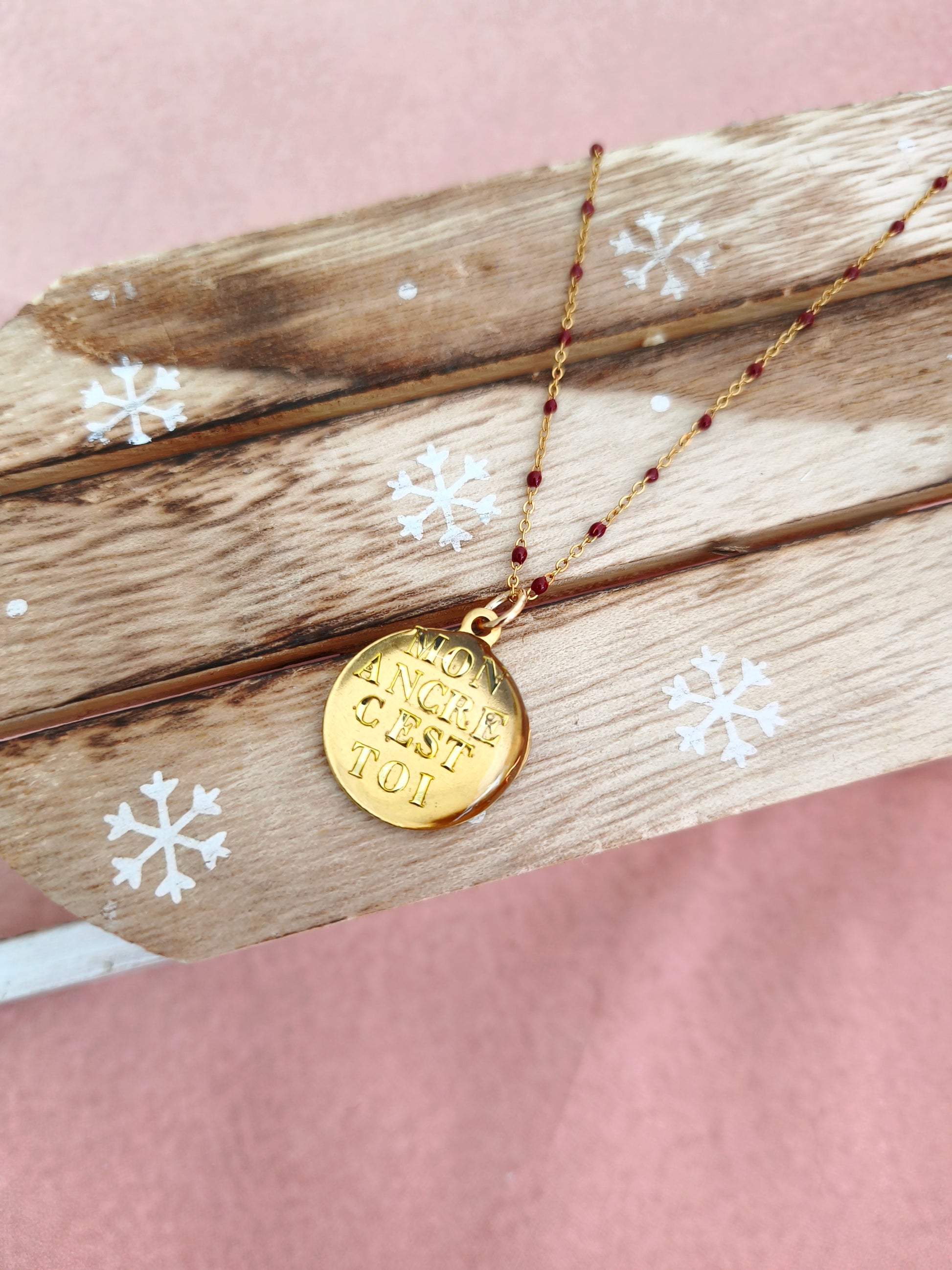 Le médaillon doré « Ose Briller » capte la lumière et les regards, tout en restant délicat.