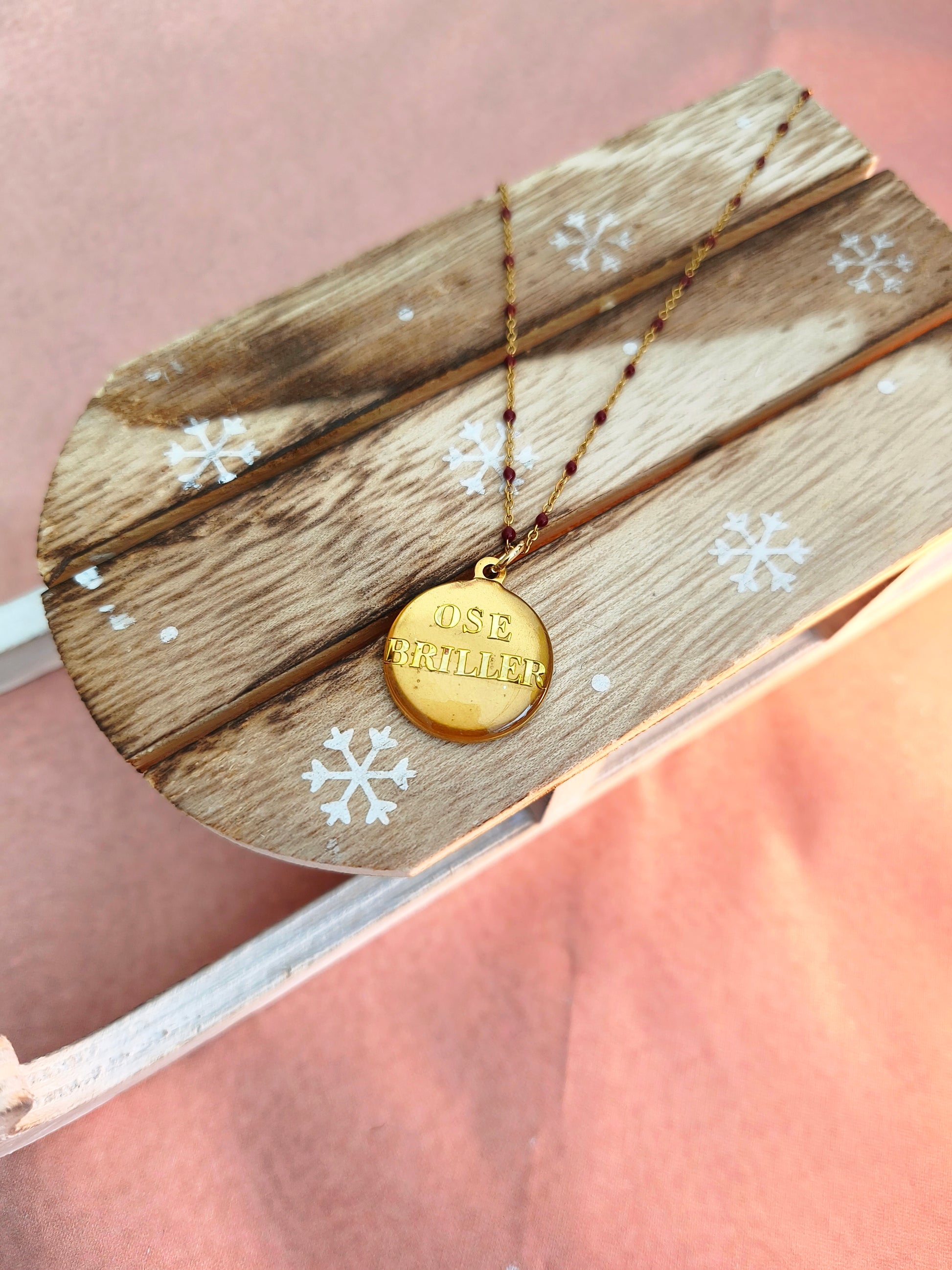 Le médaillon doré « Ose Briller » capte la lumière et les regards, tout en restant délicat.